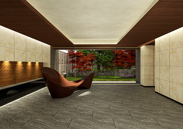 外壁から引き込まれた壁が、外部との連続した空間を構成。 光壁とアースカラーの天然石で構成された空間が高級感を漂わせ、エントランスホールへといざないます。開放感あふれる一面のガラススクリーンが連続した内外空間を創造しつつ、オブジェのようなベンチと、天然石で構成された洗練された空間が広がります。