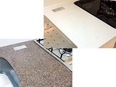 - 天然水晶が主成分のフィオレストーンを採用しました。硬度が高い為、傷や摩耗に強く水や汚れが染み込みにくく、清潔で衛生的な素材です。